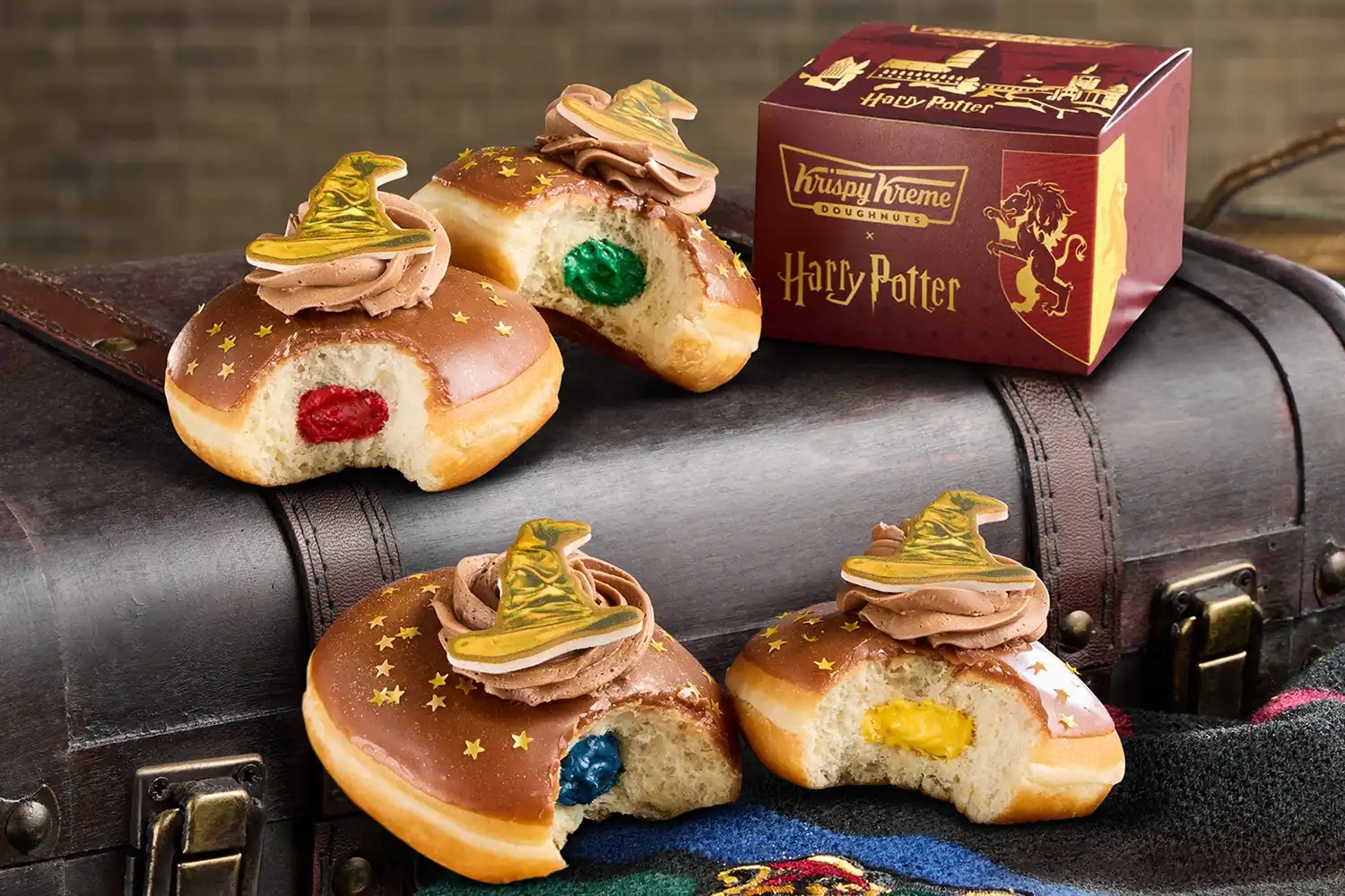 이번 콜라보를 통해 선보인 도넛은 총 5가지입니다. 각각 호그와트의 상징인 **그리핀도르, 슬리데린, 래번클로, 후플푸프 4대 기숙사와 '소팅햇(Sorting Hat)'을 형상화했습니다.